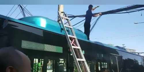 因?yàn)榫€纜跨度長,并且有高度,搶修人員的梯子一是高度不行,二是梯子沒有支撐點(diǎn)無法固定,這時(shí)公交駕馭員韓師傅與執(zhí)勤交警交流后將車輛開上了非機(jī)動(dòng)車道,充任起了暫時(shí)高架車,讓施工人員在公交車的車頂進(jìn)行弱電電纜的搶修,這樣方便了搶修人員的搶修環(huán)境。